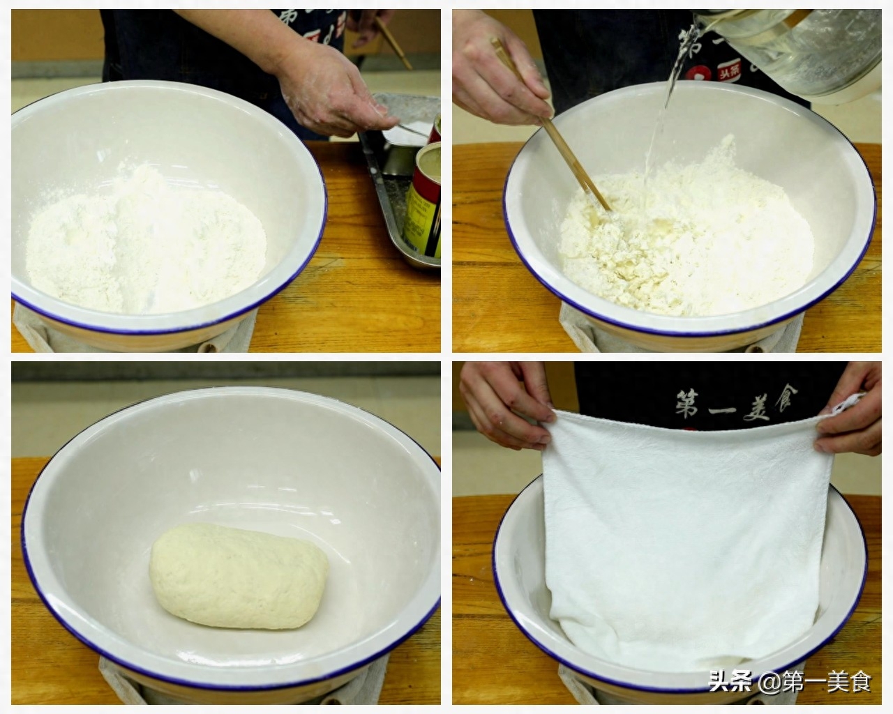 这一平碗差不多是一斤的量,咱们中间一分两半,撒上盐增加筋性。一半用开水烫,一半用清水和,先搅成絮状再揉成团。这就是咱常说的半烫面,烙出来的饼柔中带筋。面团柔光以后,盖上馏布子,放一边醒十来分钟。