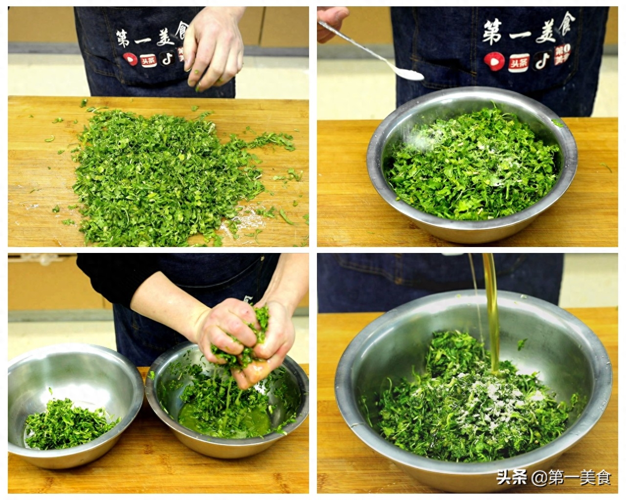 荠菜咱已经洗干净了,给它剁碎,多加点盐拌匀腌一会,杀杀水 去去土腥味。毕竟是地里长大的野菜,腌好以后把里面的水挤干净,稍微加一点鸡粉,不用再放其他调料了。