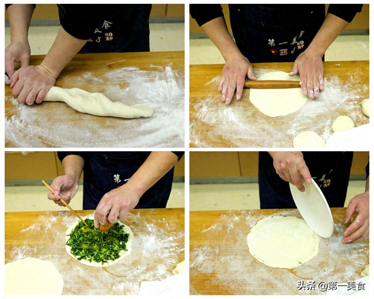 案板上撒上面粉,把醒好的面取出来。稍微揉几下子,搓条,揪面剂子 ,擀面片子,尽量中间厚两边薄,擀好以后铺上一层荠菜,磕上一个母鸡蛋,再拿个面片往上一盖,用个圆盘轧一圈。这饼坯子圆溜溜类,严丝合缝 ,丝毫不用担心流汁。