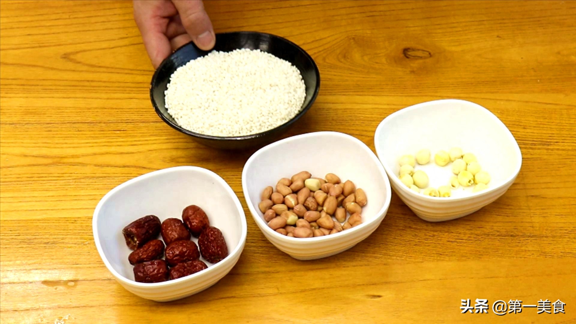 糯米、红枣、花生还另外加了一些莲子,烧半锅开水,把糯米倒进去煮一下,煮至全是白芯的状态。然后倒入花生一起煮至发黏,大概三四成熟,汤有些泛白就可以了。把糯米和花生倒出来,沥干水分。