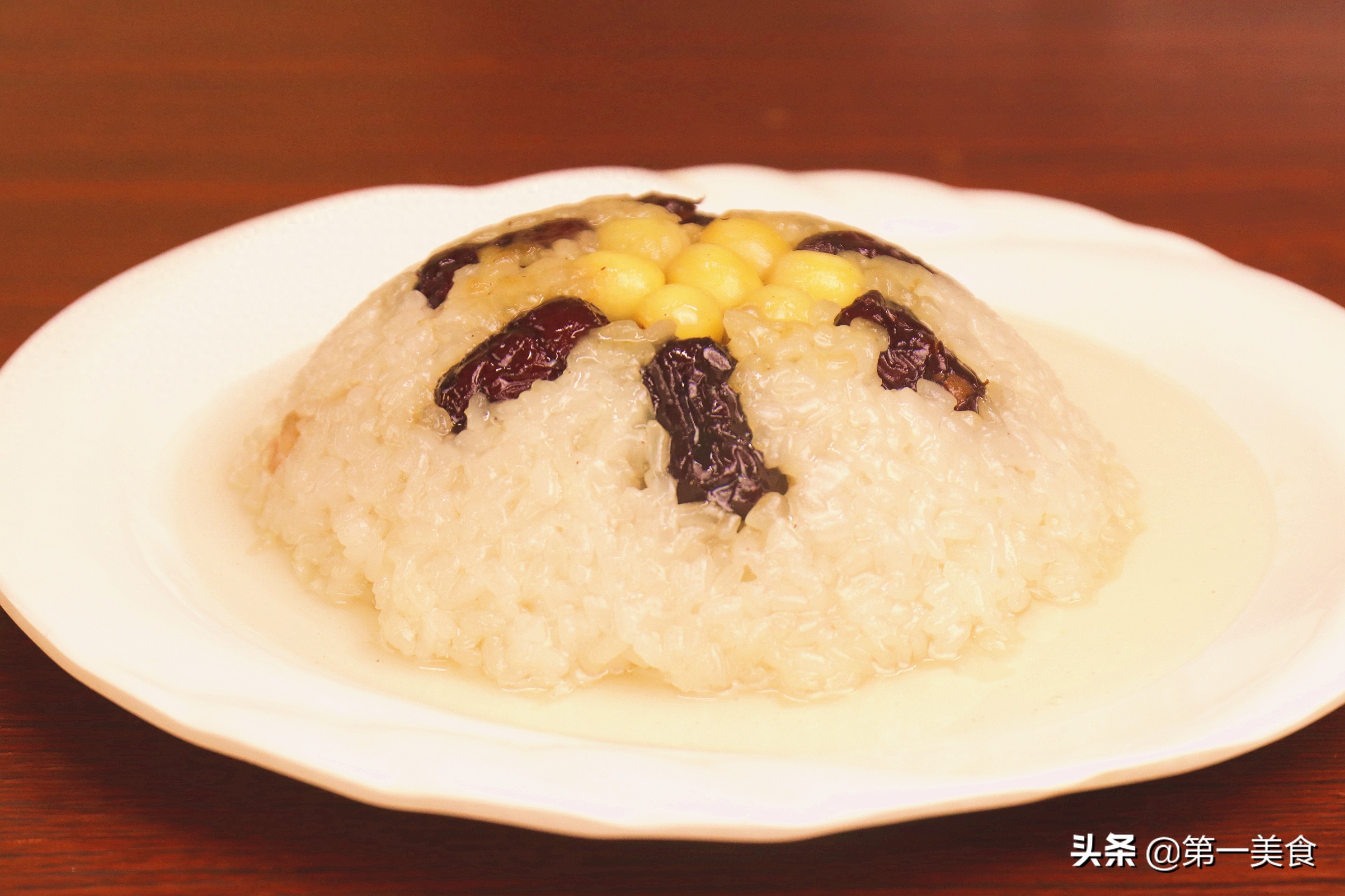蒸锅中上大气以后把糯米放进去,开中火蒸1个小时就可以了。一个小时以后,把蒸好的糯米取出来,倒扣在盘中,糯米雪白饱满 粒粒分明。这个时候甜度还不够,也不够滋润。我们还需要熬一个汁,锅内加入一勺清水放入白糖,快速搅拌化开白糖。熬成淡黄色的糖汁,然后起锅,浇在糯米上面美味即成。